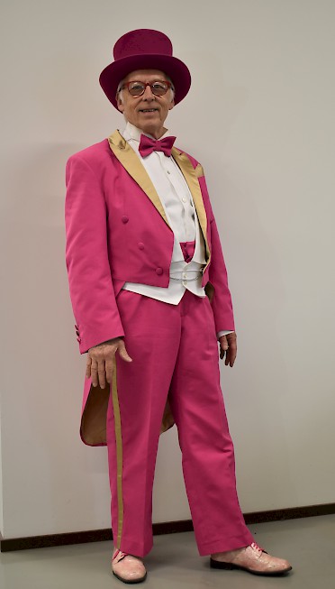 Frakki yllään asiakkaiden viihdyttäjänä Eero Lehtinen, joka on niin värikäs herra,