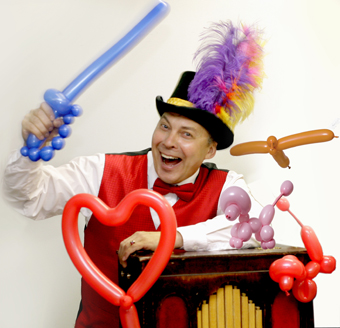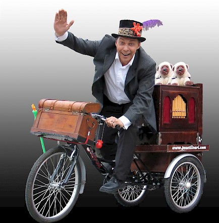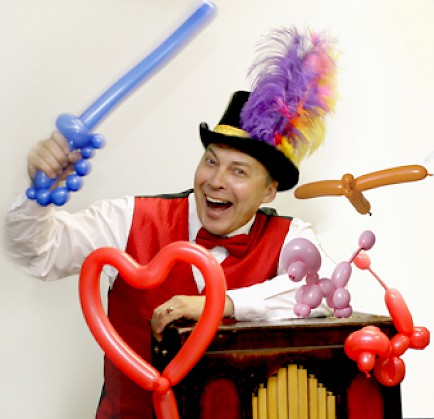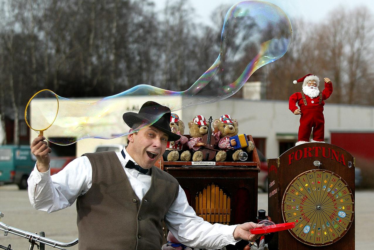 Alfred soittaa posetiivia, leikkii "eläinten" kanssa ja puhaltelee JÄTTIkokoisia saippuakuplia, tekee taikatemppuja ja ilmapallofiguureita lapsille.