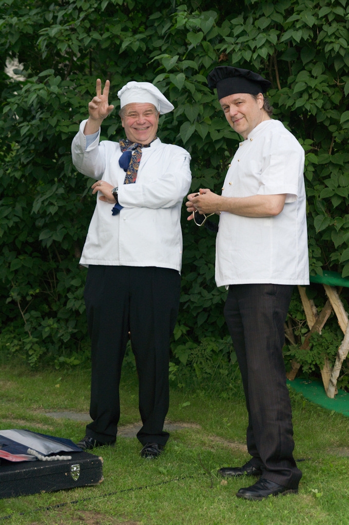 Yleisö luulee kokkeja juhlan henkilökuntaan kuuluviksi.