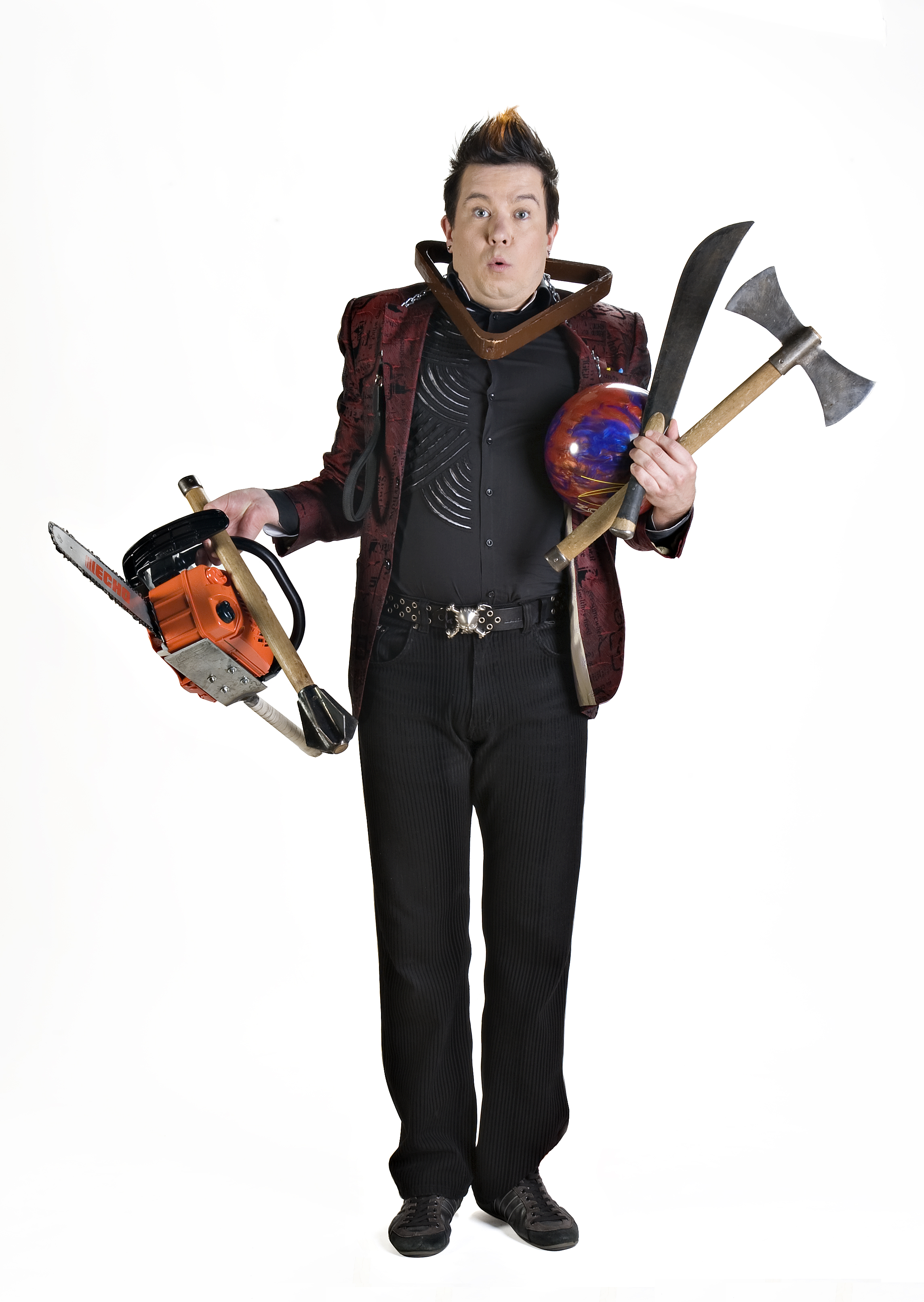 Esitys huipentuu kolmella moottorisahalla jongleeraukseen, joka on maailman vaarallisin jonglööritemppu.