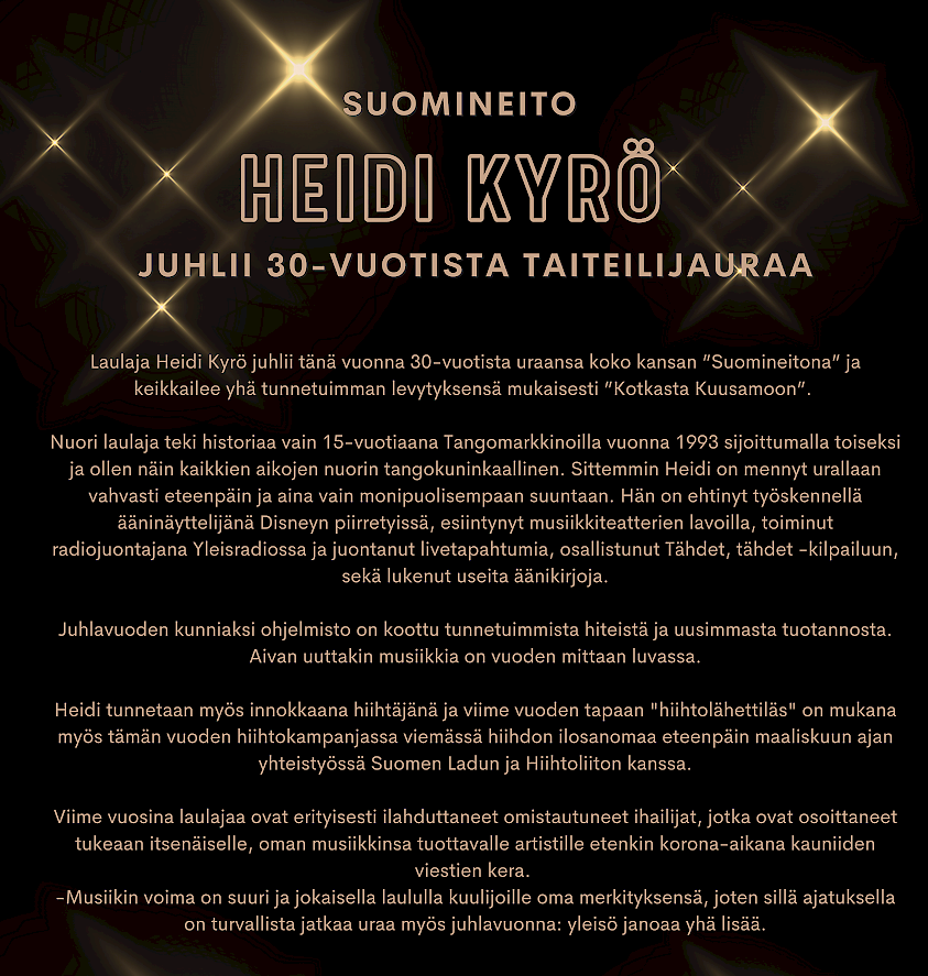 Heidi Kyrö on viihdyttänyt suomalaisia jo lähes 30 vuoden ajan. Ahkerasti levyttävä laulaja on tuttu niin esiintymislavoilta kuin radiosta sekä äänenä valkokankaallakin.